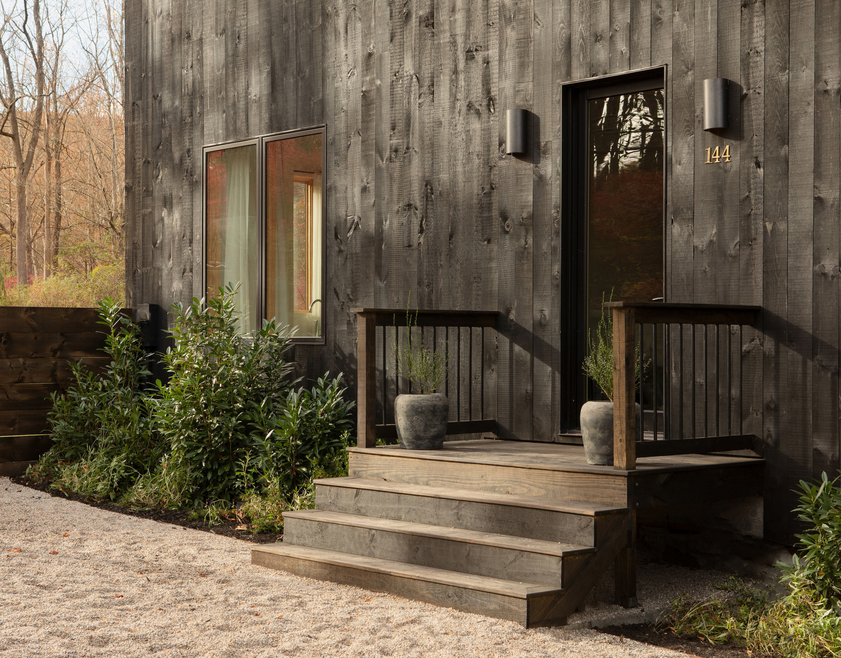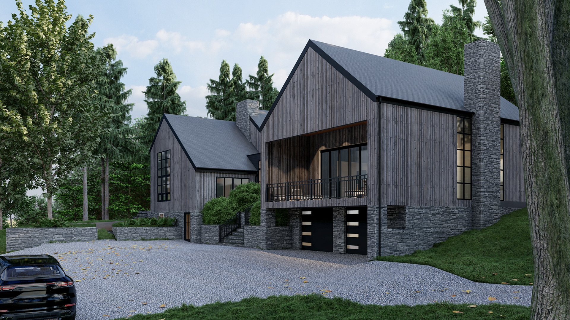 Mandra Workshop approached the redesign with a focus on proportion, texture, and material honesty. The new composition introduces a series of gabled volumes clad in weathered wood siding, anchored by stone elements that reference the original masonry. A contrasting black entry volume connects the wings, defining the new architectural identity with clarity and balance.